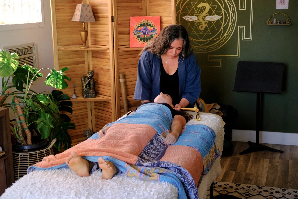 Practitioner strikes tuning forks
